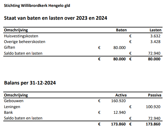 Onderstaand de staat van baten en lasten over het jaar 2023 en 2024. Tevens wordt de balans vermeld per 31 december 2024.